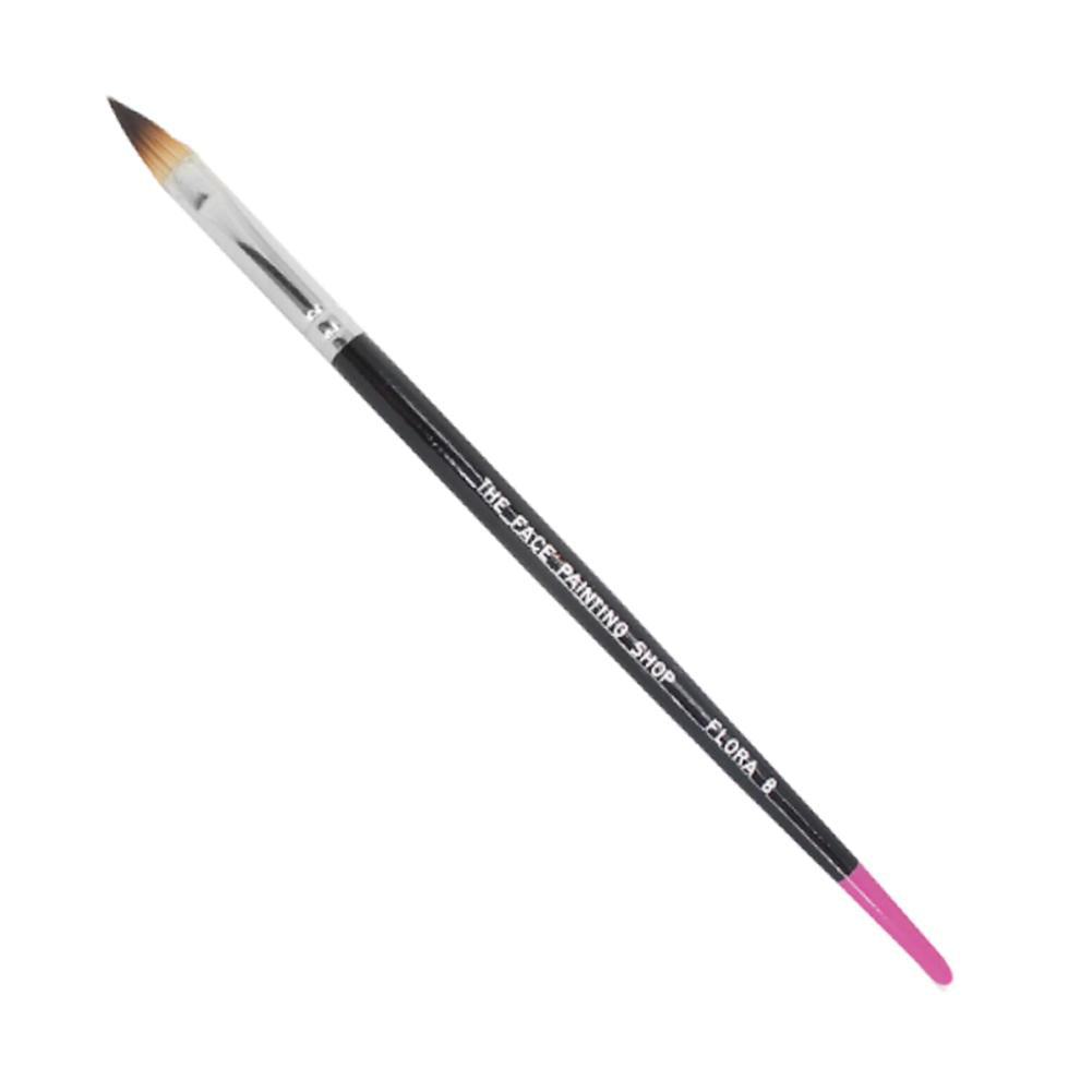 The Face Painting Shop Flora Brushes are handmade in Germany, with synthetic bristles & signature pink tipped handles, without harming any animal. Flora #8 Brush is 3/8" wide at the base and has a unique bristle shape where the pointed tip can be used for precision painting of flowers, petals & leaves and the wider portion can be used for blending. Brush head can be pressed down for unique design accents. Also available in other sizes and styles. See All Face Painting Shop Brushes